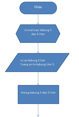 Buatlah pseudocode & flowchart untuk menghasilkan 1 liter air dengan menggunakan tabung dengan ukuran 3 liter dan 5 liter.